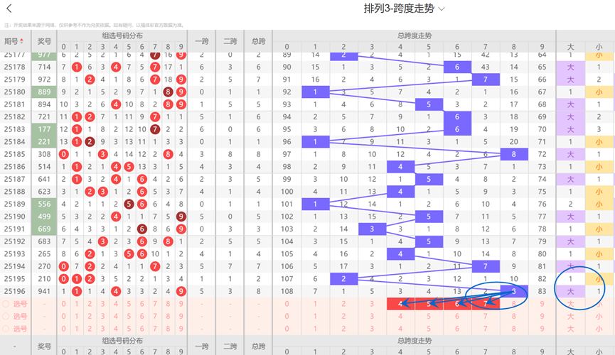 通过观察跨度及跨度属性走势可以发现:近10期内跨度09等号码遗漏值高,说明09等号码出号的可能性较小,本期跨度大概率开出09等号码,因此本期跨度选号时可以不考虑09等号码,再结合上述走势图看,本期跨度看好4567等号码。