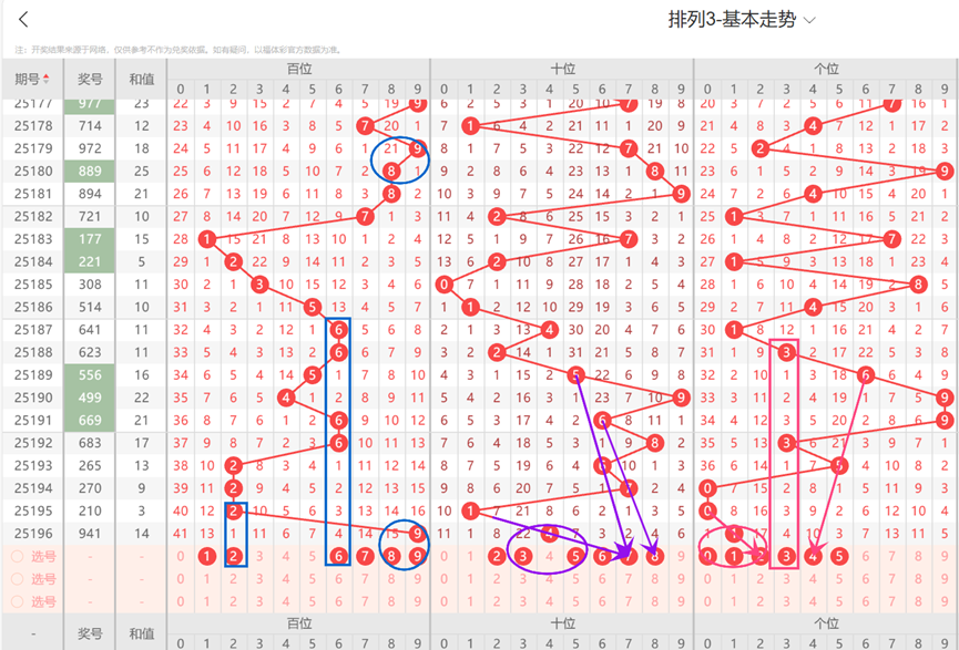 上一期百位开出号码为9,为奇数、大数、合数、0路号码:近10期百位04较少出号,本期百位开出04等号码的可能性不高,因此本期百位选号时可以不考虑04等号码,结合上述走势图看,本期百位看好126789等号码。