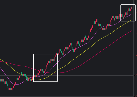 可以看到一些规律,在白框中,如果一致,那么接下来这些跨度也会出。