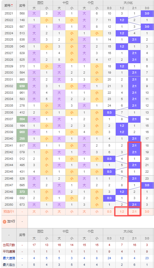 上期大小比:2:1,近10期大小比出现情况:2:1、2:1、0:3、2:1、0:3、2:1、3:0、1:2、0:3、2:1,最近10期出5期2:1,出现1期1:2,出现3期0:3,出现1期3:0,根据近10期出号规律本期推荐遗漏2期出1:2,防连出2:1,综上所述大小比推荐:防:2:1,重点关注:1:2。