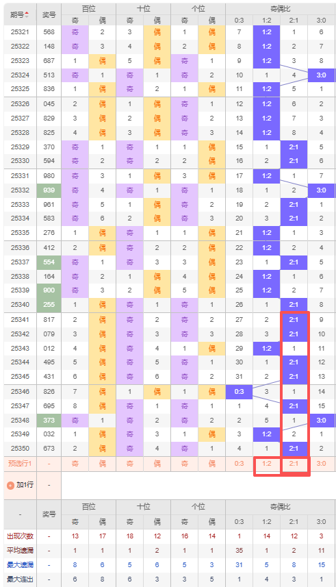 上期奇偶比:2:1,近10期奇偶比出现情况:2:1、2:1、1:2、2:1、2:1、0:3、2:1、3:0、1:2、2:1,最近10期出现6期2:1,出现2期1:2,出现1期0:3,出现1期3:0,根据近10期出号规律本期推荐隔期出1:2,防连出2:1,综上所述奇偶比推荐:防:2:1,重点关注:1:2。