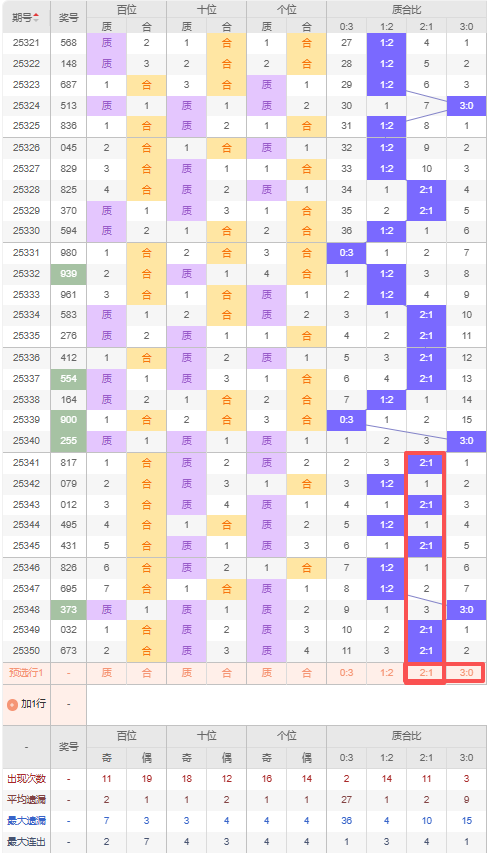 上期质合比:2:1,近10期质合比出现情况:2:1、1:2、2:1、1:2、2:1、1:2、1:2、3:0、2:1、2:1,最近10期出现5期2:1,出现4期1:2,出现0期0:3,出现1期3:0,根据近10期规律本期推荐三连出2:1,防遗漏2期3:0,综上所述质合比推荐:防:3:0,重点关注:2:1。
