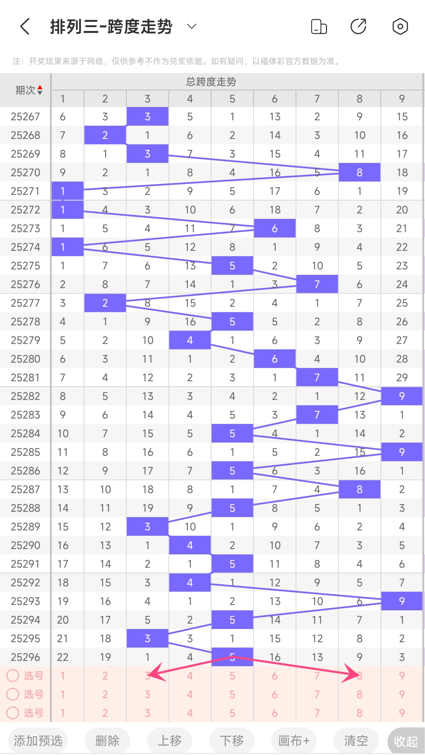 上期跨度为5,往前一期跨度是3,趋势是往右移动,偏移量为2。跨度值5时,跨度值是近30期内开出的中间位置的值。通过走势图分析,目前的趋势是可能往左也可能往右。所以推测本期跨度可能为34689等跨度。