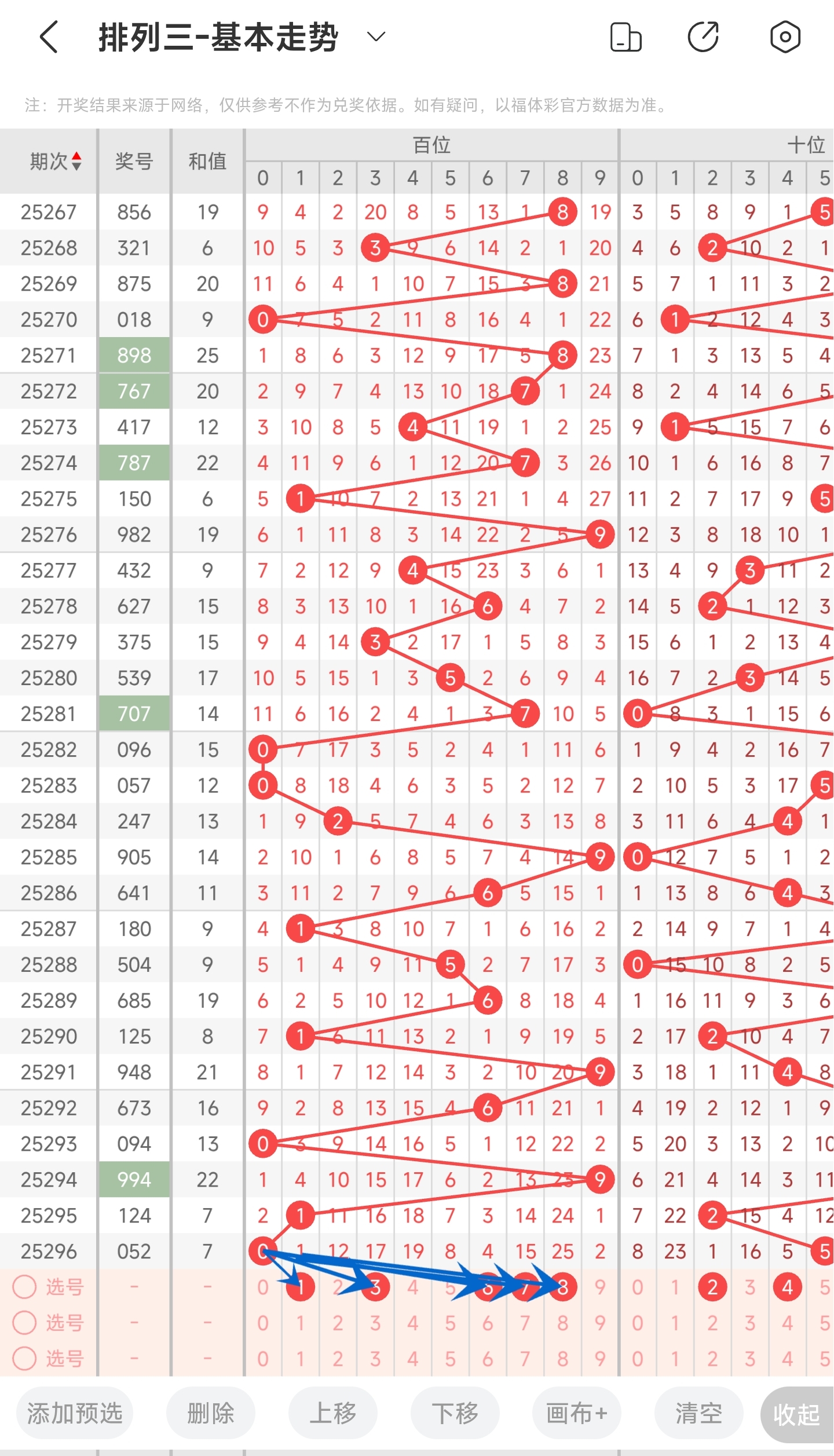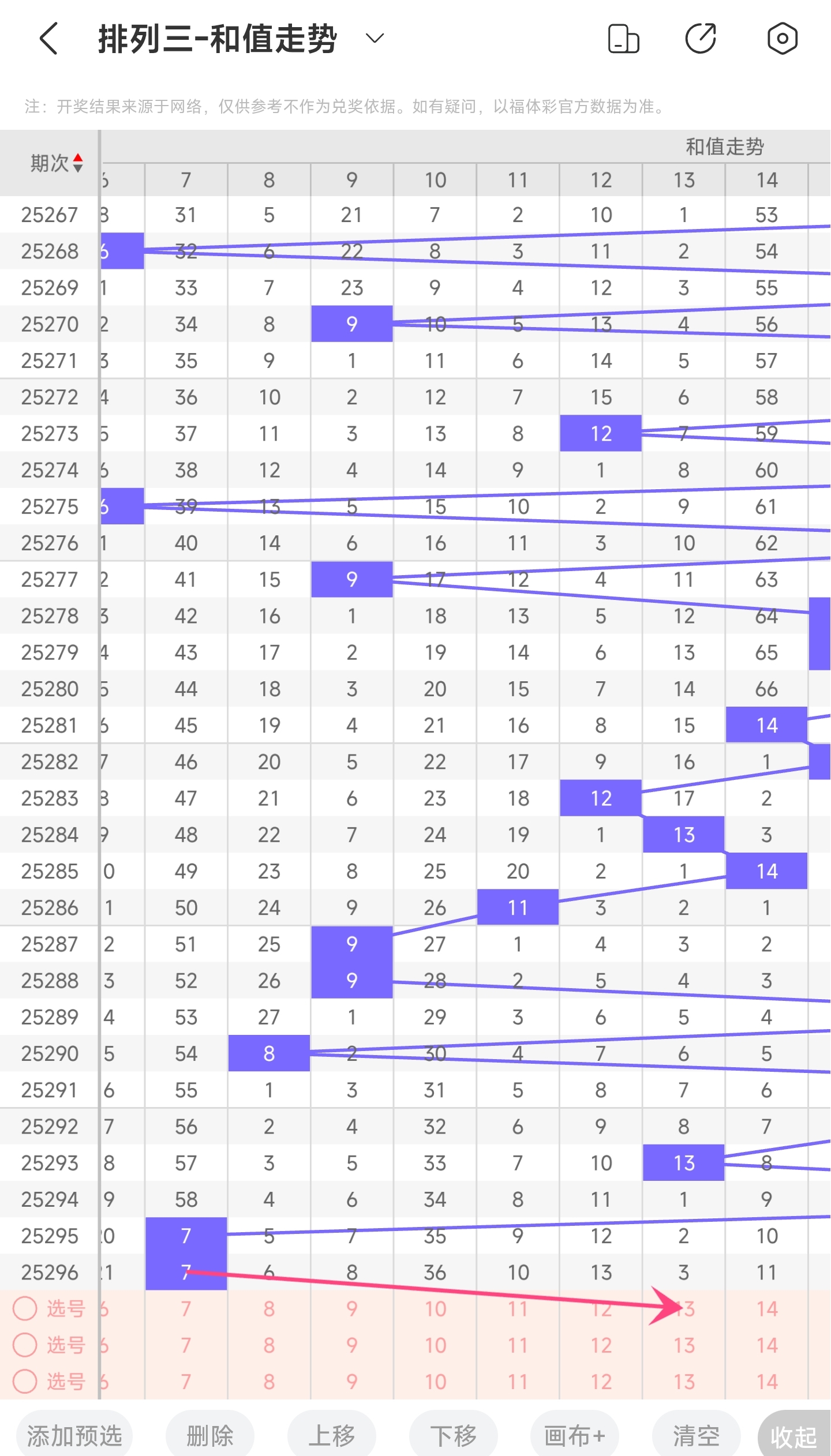 上期和值为7,往前一期和值为7,趋势没有移动,偏移量为0。通过走势图分析,7和值是近30期内开出的第二小的和值,继续下降的空间的很小,上升的空间要大很多。所以推测趋势是大概率往右,极小概率往左。本期看好大和值,因此推测本期趋势是往右的,和值会变大,极小概率趋势继续往左,和值变小。