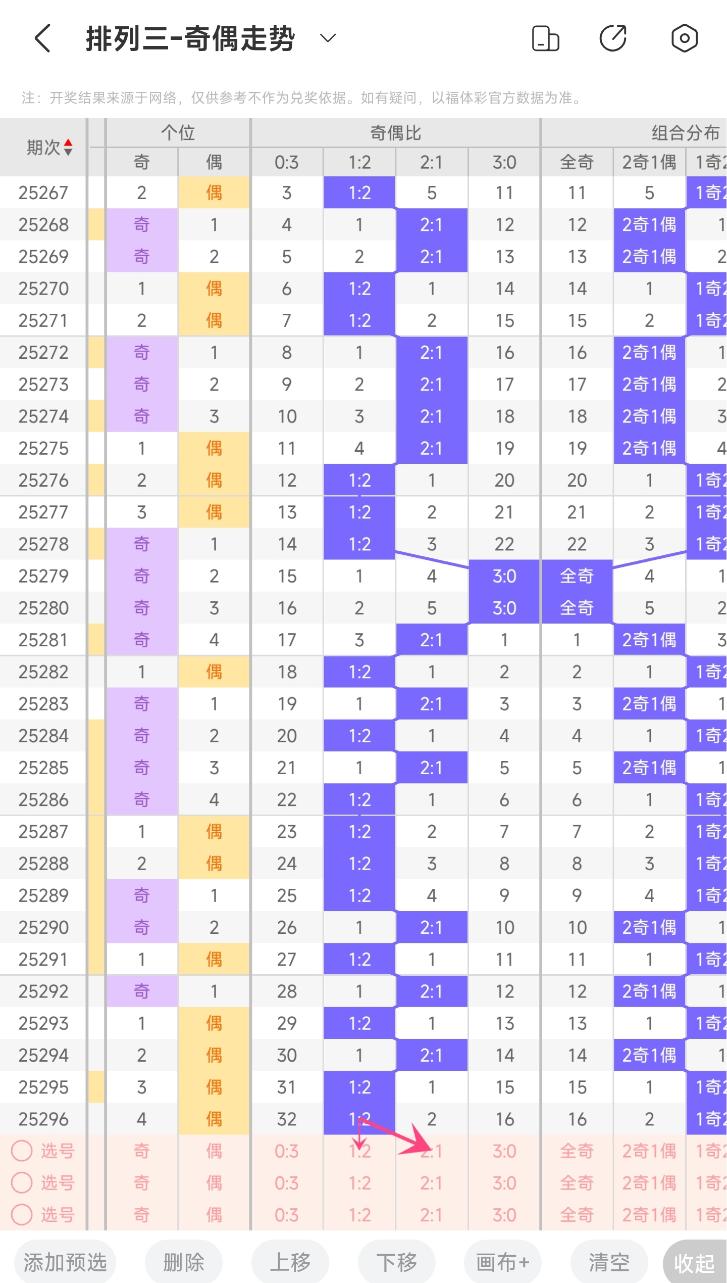 上期开出了1:2的奇偶比。往前一期是1:2奇偶比。通过分析奇偶走势图,近30期内开出1:2奇偶比的次数是16次,开出2:1奇偶比的次数是12次,3:02次,0:30次。各个类型次数没有变化。通过走势图分析,可以就看到1:2奇偶比目前非常热门,本期有可能继续开出,但本期看好2:1奇偶比的开出。所以推测本期可能开2:1奇偶比,其次是继续开1:2奇偶比,最后是3:0或者0:3奇偶比。