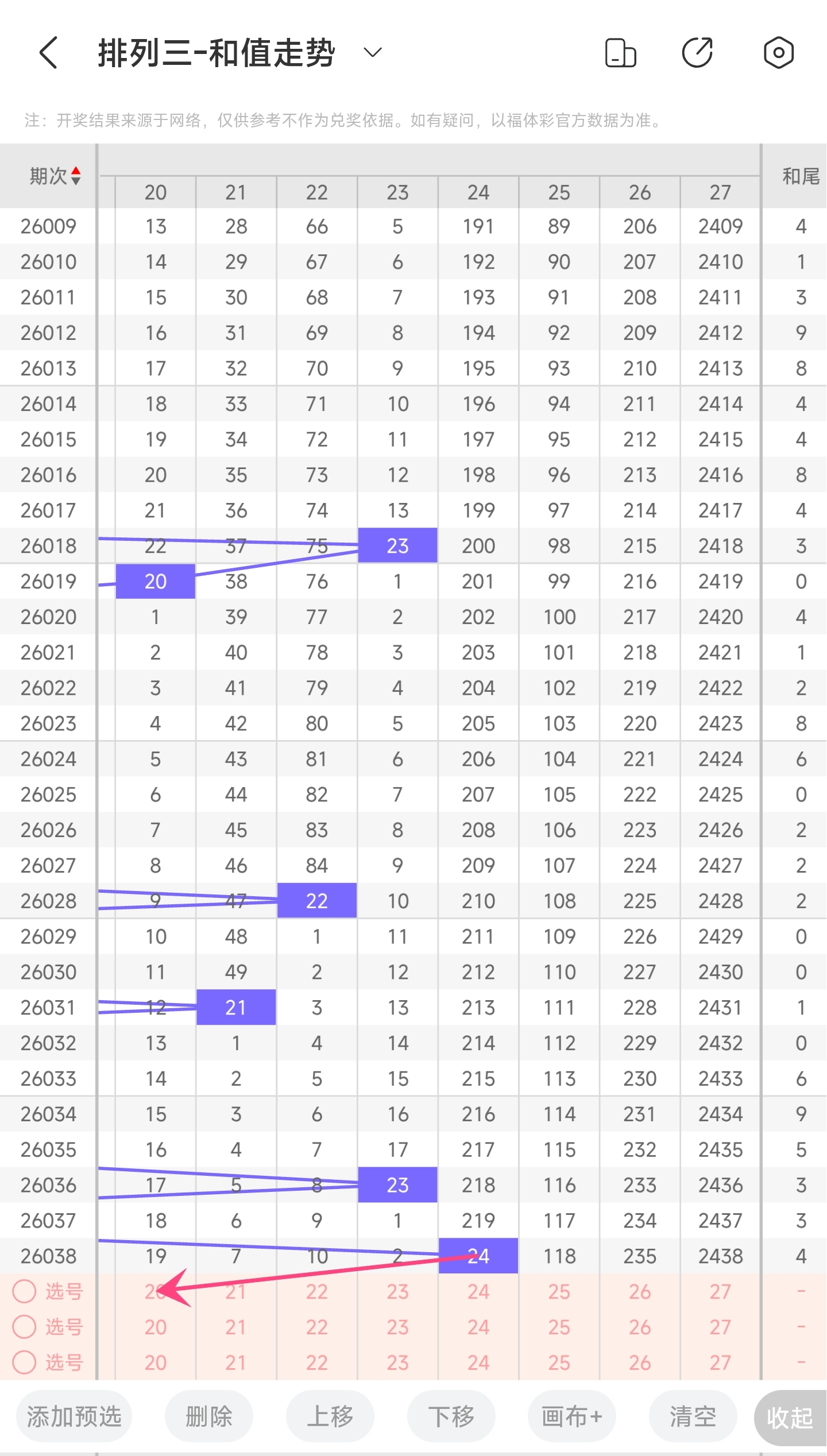 上期和值为24,往前一期和值为13,趋势往右移动,偏移量为11。通过走势图分析,24和值是近30期内开出最大的和值,上升空间非常小,下降空间很大。因此推测本期趋势是往左的,和值会变小,极小概率往右,和值变大。