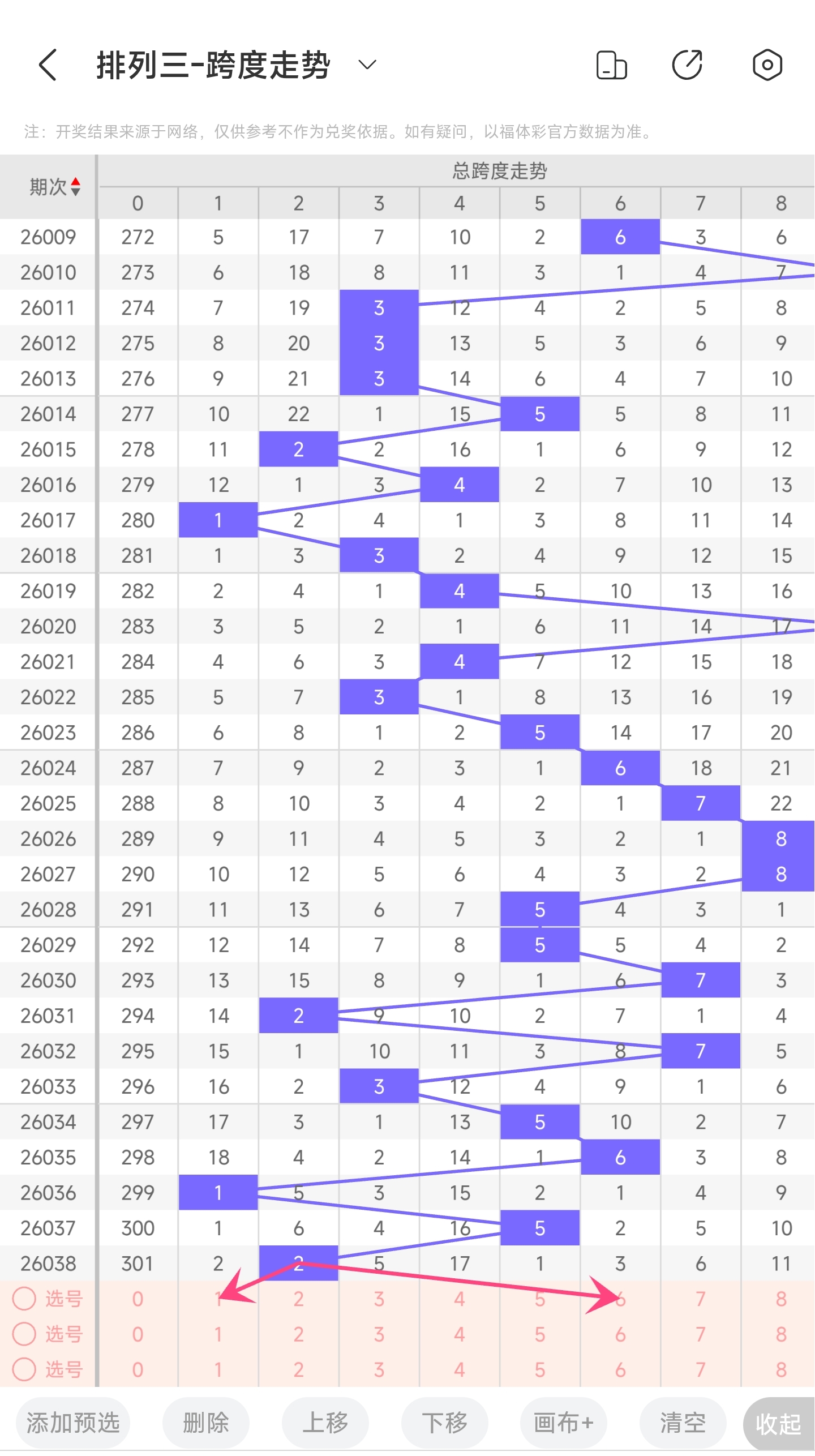 上期跨度为2,往前一期跨度是5,趋势往左移动,偏移量为3。跨度值2时,跨度值是近30期开出很小的值。通过走势图分析,目前的趋势是大概率往右的。所以推测本期跨度可能为45678等跨度。
