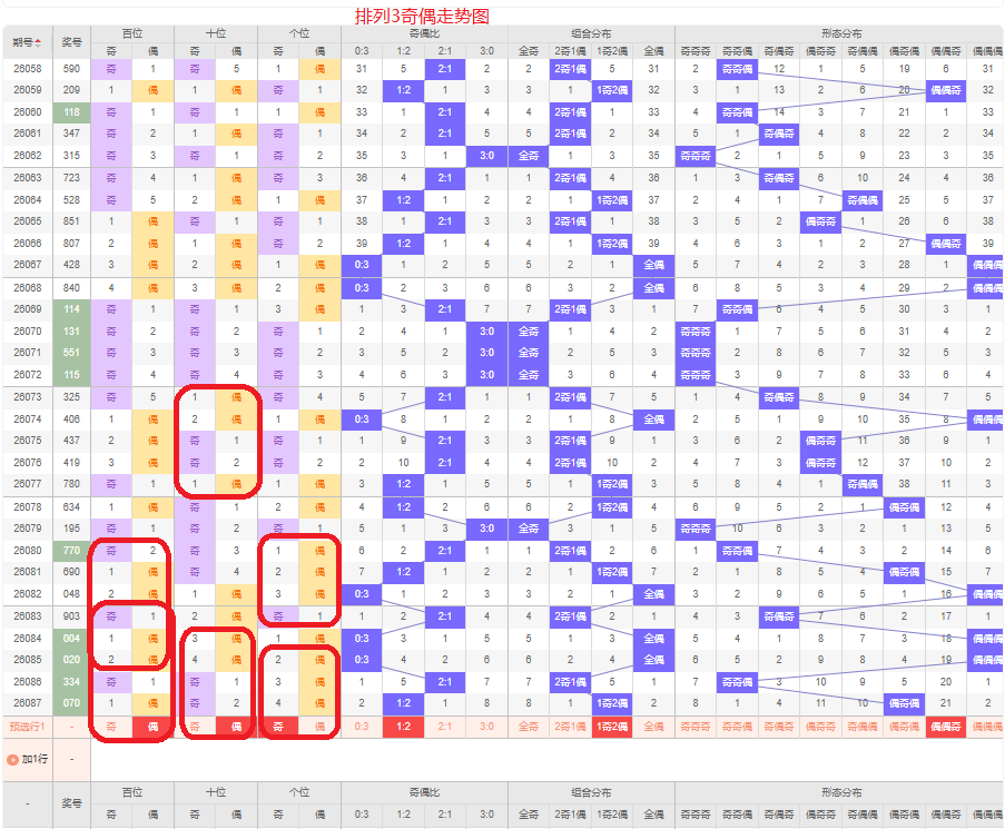 上一期的奇偶比为1:2,两偶的号码组合,从近五期的奇偶数出现情况看,奇数出5次,偶数出现10次,奇数号码出现较少,本期要侧重两偶的号码组合,侧重偶偶奇或奇奇奇的号码组合,根据奇偶组合形态可做五码定位02468/02468/13579或13579/02468/13579