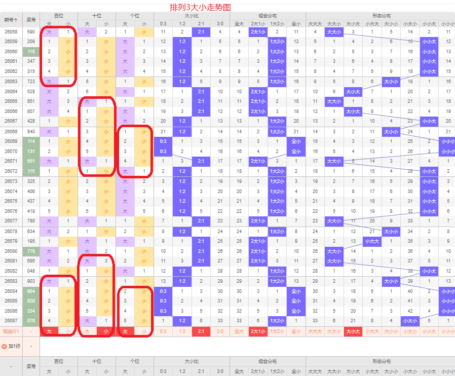 上一期大小比为1:2,两小的号码组合,近五期大号出2次,小号出13次,大号码出现较少,上一期是两小的号码组合,本期侧重两大的号码组合,百位侧重大号码,十位侧重小号码,个位侧重大号码,侧重大小大或者大小小的号码组合,根据大小形态五码定位56789/01234/56789或者56789/01234/01234