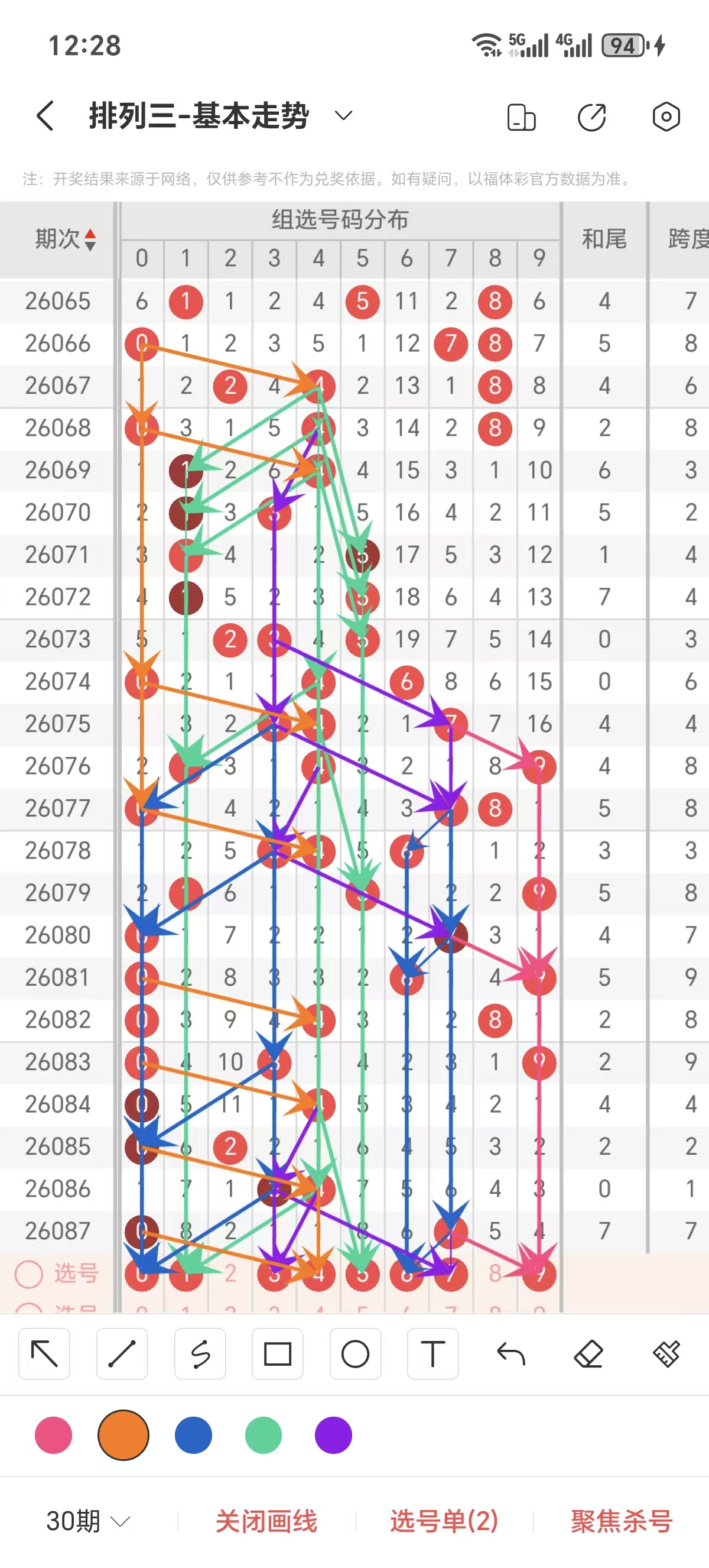 通常情况下在五期之内重复一个跨度的概率较高,近五期没有重复的跨度,近五期跨度为9/4/2/1/7,近期1路的跨度较热,本期要侧重3/4/8跨为主的号码组合。选择好跨度就可以从跨度方面选择相应的双胆码组合,双胆码的选取要根据近期和历史的走势进一步的分析选取。