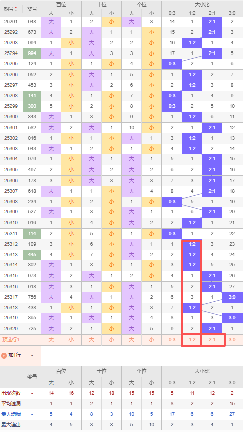 上期大小比:2:1,近10期大小比出现情况:0:3、1:2、1:2、1:2、2:1、2:1、3:0、1:2、3:0、2:1,最近10期出3期2:1,出现4期1:2,出现1期0:3,出现2期3:0,根据近10期出号规律本期推荐遗漏2期的1:2,防连出2:1,综上所述大小比推荐:防:2:1,重点关注:1:2。