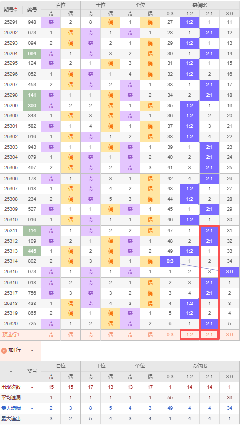 上期奇偶比:2:1,近10期奇偶比出现情况:2:1、2:1、1:2、0:3、3:0、2:1、2:1、1:2、1:2、2:1,最近10期出现5期2:1,出现3期1:2,出现1期0:3,出现1期3:0,根据近10期出号规律本期推荐连出2:1,防隔期出1:2,综上所述奇偶比推荐:防:1:2,重点关注:2:1。