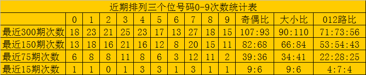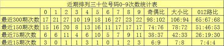 最近15期奖号由冷到热表现为:2→0次,0、1、3、6、8、9→1次,4、5、7→3次,奖号奇偶比为9:6,大小比为9:6,012路比为4:7:4。