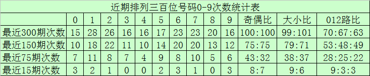百位分析:最近300期奖号由冷到热表现为:0→18次,4→25次,5→27次,3、8、9→30次,6→32次,2→34次,7→36次,1→38次,奖号奇偶比为161:139,大小比为155:145,012路比为110:99:91。