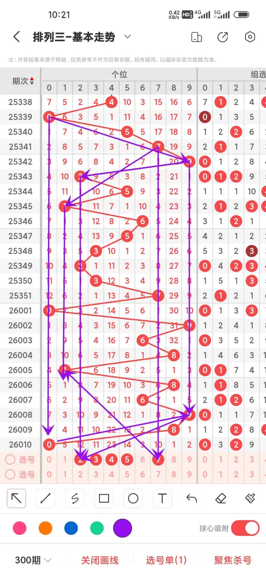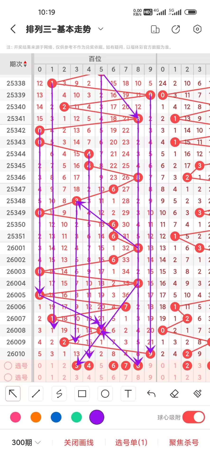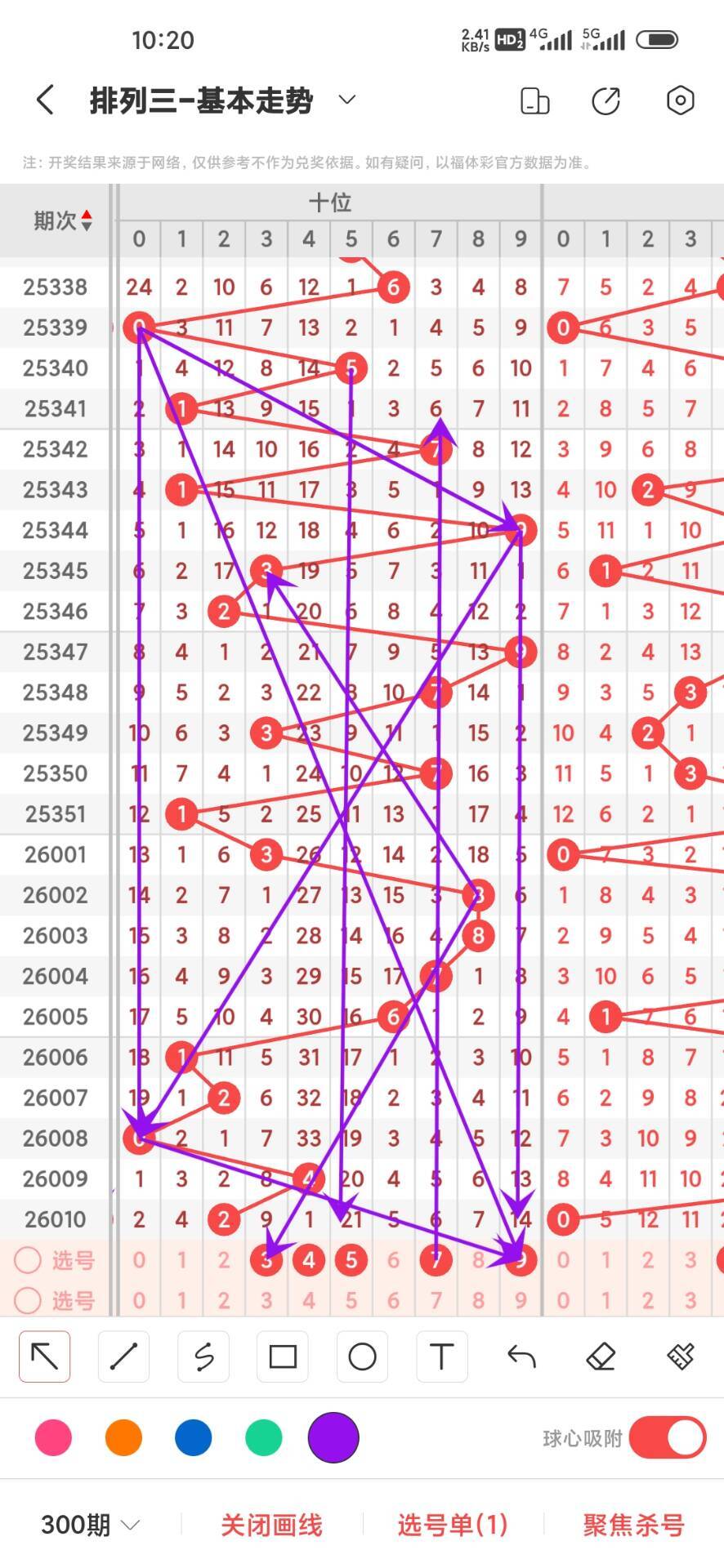 2026011期,上期个位开出偶数0,我们通过走势图来看百位上300期,0-9下号数据和最大遗漏数据,其中0出现26次,1出现30次,2出现31次,3出现38次,4出现35次,5出现29次,6出现25次,7出现34次,8出现29次,9出现23次,0-9目前差别不大,我们在回过头来看最大遗漏下号,0遗漏36次,1遗漏34次,2遗漏30次,3遗漏36次,4遗漏27次,5遗漏45次,6遗漏26次,7遗漏23次,8遗漏40次,9遗漏54次,目前遗漏中589遗漏最大,通过上面的走势分析我们可以看出目前个位上走势比较好的号码是大号,热号是偶数我们可以关注下,23457号码走势就有点冷淡我们可以防守,今天个位我们重点关注23457,具体看下面走势图