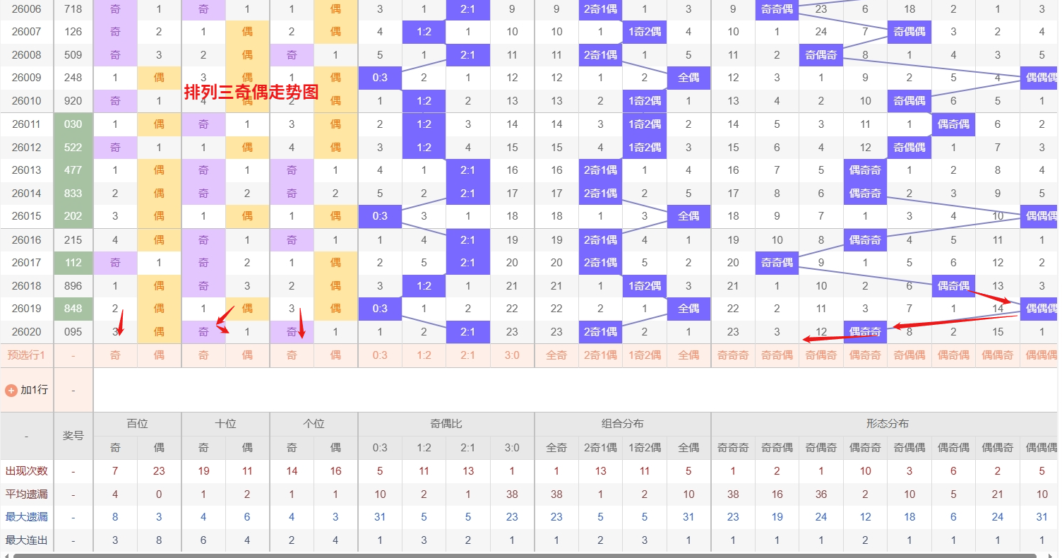 排列三 奇偶分析:从上图可以看出排列三100期内百位奇偶比约为47比53,十位奇偶比为46比54,个位奇偶比为51比49,个位的比值比较均衡,但是十位的比值偏差就有点大,历史奇偶形态近2期开出偶奇奇后下一期的走势为,第295期开出偶奇奇后296期开偶奇偶, 第302期开出偶奇奇后第303期开奇偶奇,第311期开出偶奇奇后第312期开奇奇偶,近期排列三奇偶走势分析显示,整体格局虽相对均衡,但部分特定形态已进入偏冷区间。其中,“偶奇偶”与“奇偶奇”这两种形态近期开出频率明显偏低,遗漏值逐步攀升,已积累了一定的技术性回补压力。从形态分布的平衡性来看,此类偏冷组合随时可能迎来反弹,是近期需要重点设防的对象。在制定策略时,在关注整体奇偶比例的同时,对“偶奇偶”和“奇偶奇”这两种冷态形态予以特别关注,所以排列三2026021期奇偶形态推偶奇偶与奇偶奇。
