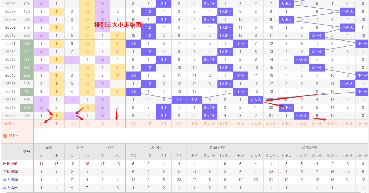 排列三 大小形态分析:从大小走势图上可以看出排列三100期内百位大小比约为48比52,十位大小比约为45:55,个位大小比约为54比46,除了个位奇数比偶数多,十位和百位偶数比奇数多。历史数据近2期开出小大大下一期的走势为,第292期开出小大大第293期开小小大。第307期开出小大大后第308期开大小大,第315期开出小大大后316期开小小小。近期排列三大小走势呈现明确的冷热分化。其中“大小大”组合持续热出,表现活跃,显示出较强的形态惯性,短期内仍需作为关注重点。另一方面,“小小大”组合则已遗漏较长时间,逐渐步入冷态,从概率均衡与形态轮动的角度分析,其回补的动能正在不断累积,存在较高的反弹可能,是当前阶段需要重点设防的对象。整体而言,走势正处于热态延续与冷态转换的关键节点,策略上在追踪“大小大”热势的同时,警惕“小小大”冷态组合的技术性回补,所以排列三第2026021期大小形态推荐小小大防大小大。