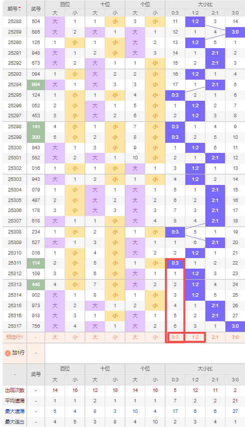上期大小比:3:0,近10期大小比出现情况:0:3、2:1、1:2、0:3、1:2、1:2、1:2、2:1、2:1、3:0,最近10期出3期2:1,出现4期1:2,出现2期0:3,出现1期3:0,根据近10期出号规律本期推荐开对称0:3,防遗漏3期的1:2,综上所述大小比推荐:防:1:2,重点关注:0:3。