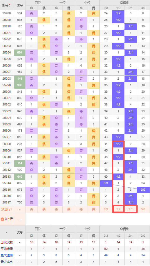上期奇偶比:2:1,近10期奇偶比出现情况:1:2、2:1、1:2、2:1、2:1、1:2、0:3、3:0、2:1、2:1,最近10期出现5期2:1,出现3期1:2,出现1期0:3,出现1期3:0,根据近10期出号规律本期推荐遗漏4期的1:2,防三连出2:1,综上所述奇偶比推荐:防:2:1,重点关注:1:2。