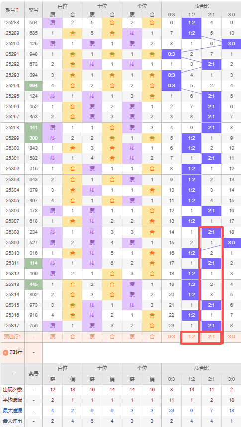 上期质合比:2:1,近10期质合比出现情况:2:1、3:0、1:2、2:1、1:2、1:2、1:2、2:1、1:2、2:1,最近10期出现4期2:1,出现5期1:2,出现10期0:3,出现1期3:0,根据近10期规律本期推荐连出2:1,防隔期出1:2,综上所述质合比推荐:防:1:2,重点关注:2:1。