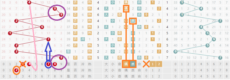 个位上上期我们准确的说出了必开0路号码。但是我们得重点放在了号码36上,对于号码9没有选择考虑。那么本期我们在来说说个位,首先0路号码不会再次出现那么差别号码3我们就不在考虑。其中我们按照奇偶比的走势上可以的出一个结论,本期当中偶质号码特别好,所以号码2还是得重点考虑。所以在本期当中在号码2至9之间供我们选择的就只剩下了478.