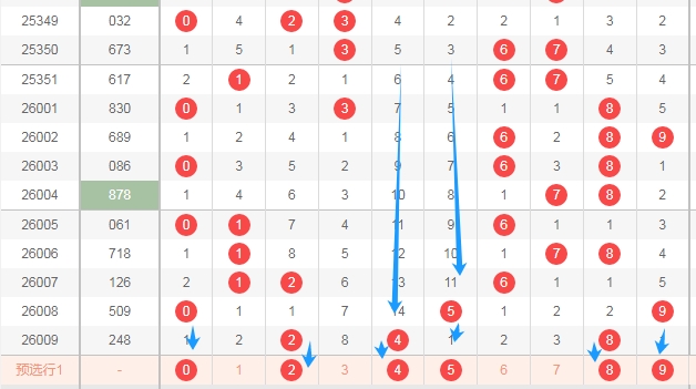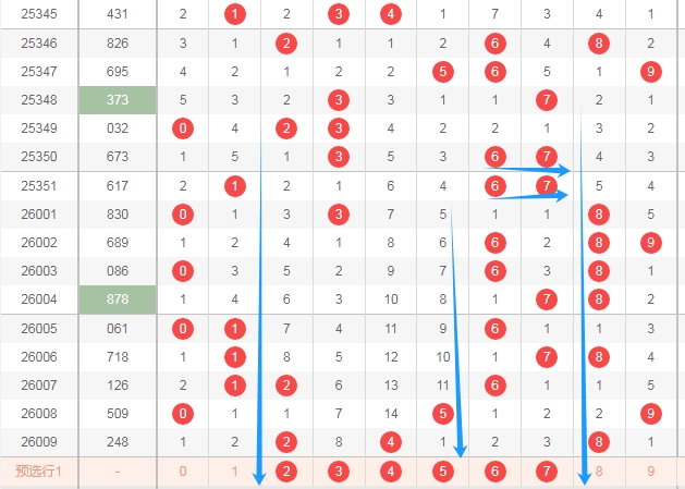 上图是体彩排列三开奖号码分布走势图,我在上面走势图中标注出来的数字0 2 4 5 8 9都是遗漏周期小的数字,个人觉得这几个数字可以关注出1个或者2个,3个也是有可能的。因为你们看我在上面走势图中画出来的蓝色大箭头表示的遗漏周期大的走势,上期数字4遗漏周期是14期,上上期数字5遗漏周期11期,连续开出了两个那么大的遗漏周期,所以本期要关注遗漏周期小的数字。