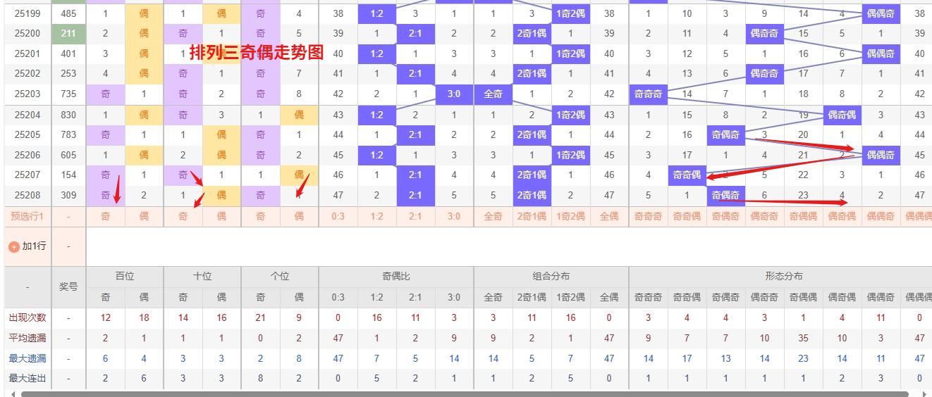 排列三 奇偶分析:从上图可以看出排列三100期内百位奇偶比约为47比53,十位奇偶比为55比45,个位奇偶比为49比51,个位的比值比较均衡,但是十位的比值偏差就有点大,历史奇偶形态近2期开出奇偶奇后下一期的走势为,第117期开出奇偶奇后118期开偶偶奇, 第127期开出奇偶奇后第128期开偶偶偶,第131期开出奇偶奇后第132期开偶偶偶。近期排列三奇偶走势中,"偶偶奇"组合持续热出,表现极为活跃,短期内仍有连开可能,需重点关注其延续性;而"奇偶偶"和"偶偶偶"则长期处于冷态,尤其是"偶偶偶"组合已遗漏长达47期,达到历史极值附近,回补压力极大,极有可能在近期强势反弹。从历史规律来看,热态组合"偶偶奇"可能维持高频出现,但冷态组合"偶偶偶"在深度遗漏后随时可能触底回补,甚至可能迎来爆发式回补。在跟进"偶偶奇"热态组合的同时,必须重点防范"偶偶偶"的强势回归,所以排列三2025209期奇偶形态推偶偶奇与偶偶偶。