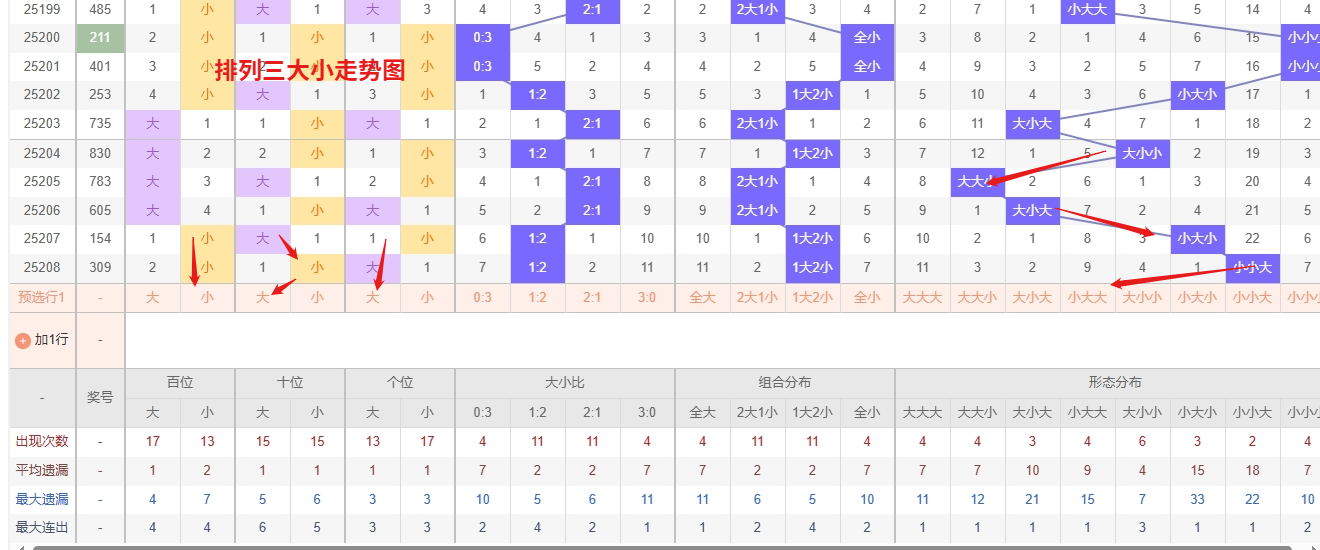 排列三 大小形态分析:从大小走势图上可以看出排列三100期内百位大小比约为53比47,十位大小比约为48:52,个位大小比约为51比49,除了十位奇数比偶数多,百位和个位是偶数比奇数多。历史数据近2期开出小小大下一期的走势为,第111期开出小小大第112期开大小小。第127期开出小小大后第128期开大大大,第136期开出小小大后137期继续开小小大。近期排列三大小走势呈现明显分化,"大小小"和"大大大"组合持续热出,尤其"大大大"表现抢眼,短期内仍有连开可能;而"小小大"组合则陷入深度冷态,遗漏期数持续攀升,随时可能迎来强势反弹。从盘面观察,热号组合"大小小"和"大大大"交替走强,形成双热点格局,这种趋势短期内或将继续维持;但值得注意的是,冷态组合"小小大"在长期遗漏后,其回补动能正在不断累积,极可能在近期出现报复性反弹。在追热的同时,务必对冷号"小小大"保持警惕,可采取"热号为主、冷号为辅"的投注策略,所以排列三第2025209期大小形态推荐大小小防大大大。