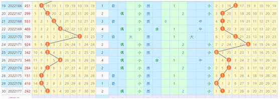 不管是0还是3做最小数,说明0开出的机会已经很大了,从这个角度看号码0会渐渐复出,因为毕竟用3做最小数字,还需要排除012这么3个号码,难度还是比较高的,只有0做为最小数字才是顺应了历史潮流,把半个月未开0的大遗漏统统打破吧。