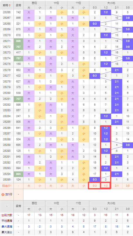 上期大小比:0:3,近10期大小比出现情况:1:2、1:2、1:2、3:0、1:2、2:1、2:1、1:2、2:1、0:3,最近10期出3期2:1,出现5期1:2,出现1期0:3,出现1期3:0,根据近10期出号规律本期推荐遗漏2期的1:2,防连出0:3,综上所述大小比推荐:防:0:3,重点关注:1:2。