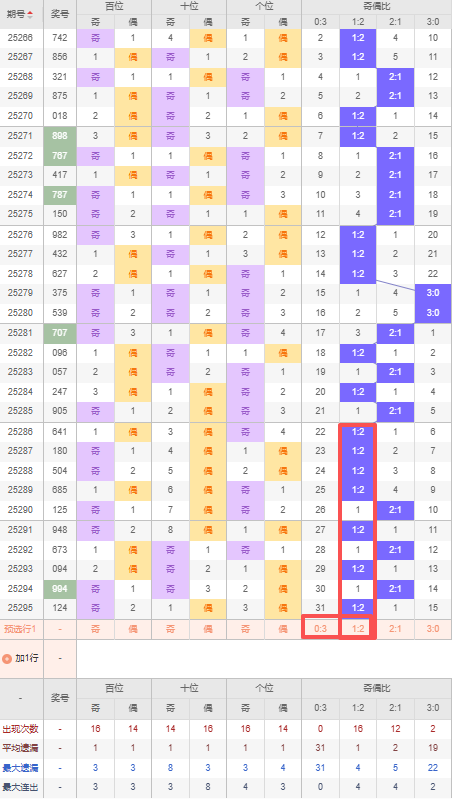 上期奇偶比:1:2,近10期奇偶比出现情况:1:2、1:2、1:2、1:2、2:1、1:2、2:1、1:2、2:1、1:2,最近10期出现3期2:1,出现7期1:2,出现0期0:3,出现0期3:0,根据近10期出号规律本期推荐看好连出1:2,防遗漏31期的0:3,综上所述奇偶比推荐:防:0:3,重点关注:1:2。