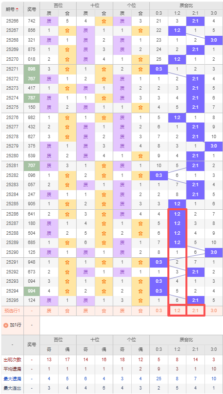 上期质合比:2:1,近10期质合比出现情况:1:2、1:2、1:2、1:2、3:0、0:3、2:1、0:3、0:3、2:1,最近10期出现2期2:1,出现4期1:2,出现3期0:3,出现1期3:0,根据近10期规律本期推荐遗漏6期的1:2,防连出2:1,综上所述质合比推荐:防:2:1,重点关注:1:2