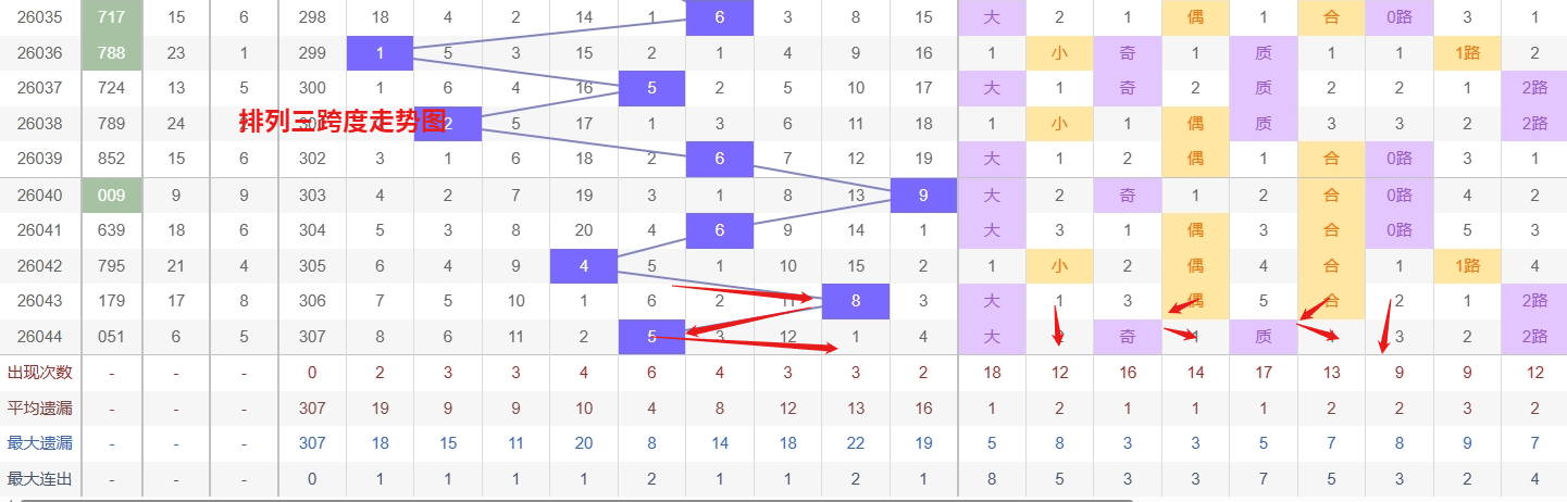 排列三 跨度分析:从上图可以看出近100期的跨度大小比约为48比52,跨度奇偶比约为49比51总体来看还是比较均衡的,但跨度大小之间有点差异。我们再从历史开出5跨后下一期7跨度数据来做参考。最近10期跨度大小比约为5:5期开出小数跨度过多返回大数跨度的概率更高一点。历史开奖近2期出5跨以后的走势为312期开出5跨后下一期走7跨走出2振幅,第327期开出5跨后下一期走9跨走4振幅第334期开出5跨后下一期开出2跨走出3振幅。连续多期小振幅,近期排列三跨度走势来看,号码6跨作为热号表现活跃,近期出号频率较高,呈现出热号恒强的特征,在热度尚未消退的情况下,需重点防范其继续连下的可能;与此同时,7跨作为温号,目前正处于临界状态,近期出现频率有所增加,呈现出由温转热的迹象,其走势值得密切关注。综合来看,跨度选择上既要留意热号6跨的连开趋势,也要对7跨的升温势头做好防守准备。跨度走出1到4个振幅看好的跨度有2679跨,所以第2026045期排列三跨度推荐2679跨。