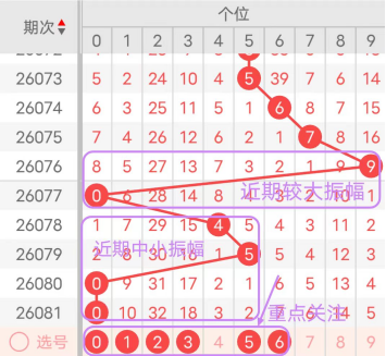 7期(075~081)开奖号个位号码球分别为7、9、0、4、5、0、0,开奖号与上一期走出的振幅分别为1、2、9、4、1、5、0。075期走出7号大数号码球,走出“1”的小幅度,076期走出9号大数号码球,走出“2”的小幅度,077期走出0号小数号码球,走出“9”的大幅度,078期走出4号中小数号码球,走出“4”的中小幅度,079期走出5号中大数号码球,走出“1”的中幅度,080期走出0号小数号码球,走出“5”的中大幅度,081期走出0号小数号码球,走出“0”的小幅度;从近期振幅大小的走势及大小走势来看,中大振幅走在5~6之间较为适宜,中小振幅走在0~3之间较为适宜;结合走势图的整体及大小走势分析,本期个位应重点关注号码球为0、1、2、3、5、6