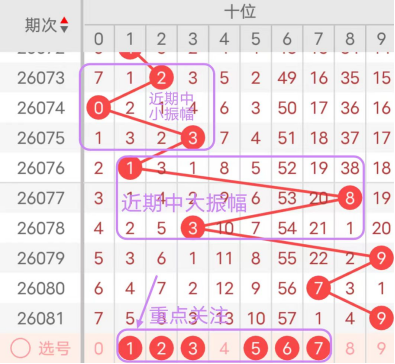 7期(075~081)开奖号十位号码球分别为3、1、8、3、9、7、9,开奖号与上一期走出的振幅分别为3、2、7、5、6、2、2。075期走出3号中小数号码球,走出“3”的中小幅度,076期走出1号小数号码球,走出“2”的小幅度,077期走出8号大数号码球,走出“7”的大幅度,078期走出3号中小数号码球,走出“5”的中大幅度,079期走出9号大数号码球,走出“6”的中大幅度,080期走出7号大数号码球,走出“2”的小幅度,081期走出9号大数号码球,走出“2”的小幅度;从振幅大小及走势图的整体对应来看,中大振幅走在6~8之间较为适宜,中小振幅走在2~4之间较为适宜;结合走势图的上下对应及振幅大小分析,本期十位应重点关注号码球为1、2、3、56、7。