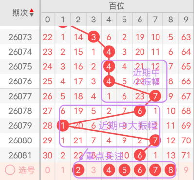 7期(075~081)开奖号百位号码球分别为4、4、7、6、1、7、6,开奖号与上一期走出的振幅分别为0、0、3、1、5、6、1。075期走出4号中小数号码球,走出“0”的小幅度,076期走出4号中小数号码球,走出“0”的小幅度,077期走出7号大数号码球,走出“3”的中小幅度,078期走出6号中大数号码球,走出“1”的小幅度,079期走出1号小数号码球,走出“5”的中大幅度,080期走出7号大数号码球,走出“6”的中大幅度,081期走出6号中大数号码球,走出“1”的小幅度;从振幅大小及走势图的整体形势来看,中大幅度走在3~4之间较为适宜,中小幅度走在0~2之间较为适宜;结合走势图的整体及大小走势分析,本期百位需重点关注号码球为2、4、5、6、7、8