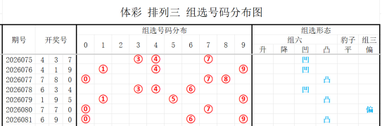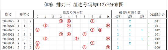 7期(075~081)开奖号与012路组合分别为437(011)、419(011)、780(012)、634(001)、195(012)、770(011)、690(000)上期开奖号为000路组合,根据整体走势分析,本期看好的012路组合有:002、012、022,001、011、222路组合。