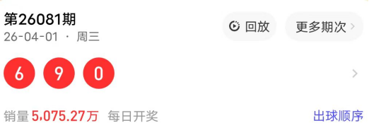 2026081期开奖号码为690,奇偶值为12偶;大小值为21小;012路走势为000路;跨度为9跨;和值15点;组六形态。