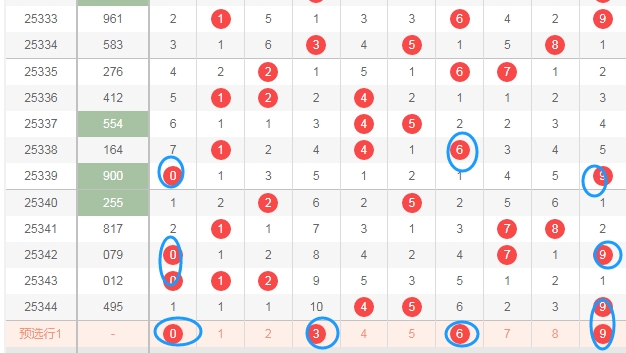 上图是体彩排列上哪开奖号码分布走势图,我在上面图中标注的蓝色小圈圈表示的最近0路球数字,体彩排列三10个数字可以分为0路球数字0 3 6 9,1路求数字1 4 7,2路球数字2 5 8。最近开出的0路球数字不多,本期可以关注0路球数字0 3 6 9出1个或者2个。