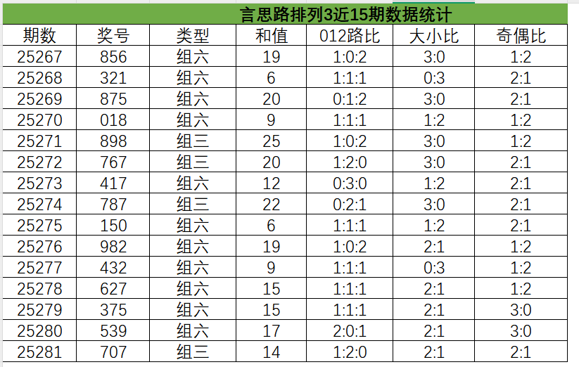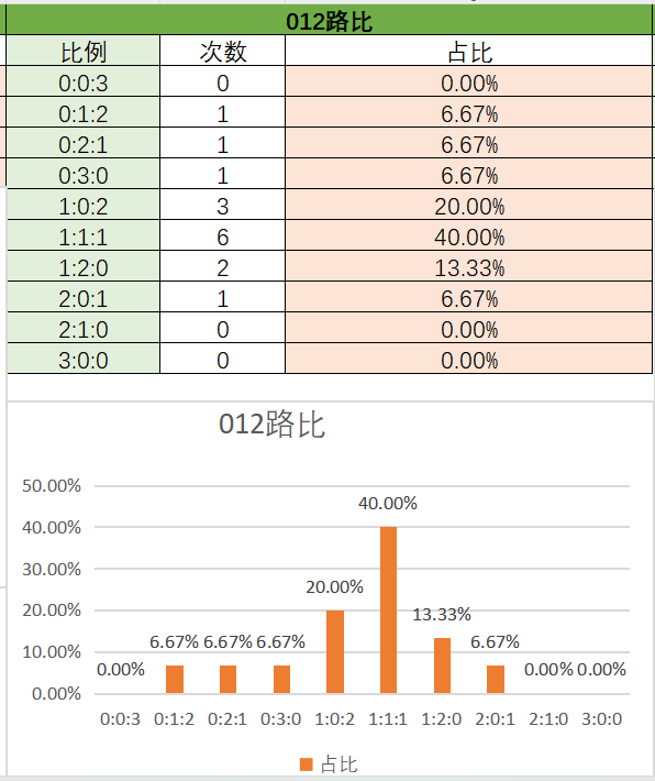 上期开了1:2:0,上期1:2:0占比变大,0:2:1占比变小。综合分析,目前最热门的是1:1:1,其次是1:0:2,再接着是0:2:1,然后就是0:1:2,0:3:0以及1:2:0和2:0:1;整体上看1路是目前最热门的,本期可以重点关注1:1:1和1:2:0以及1:2:0。