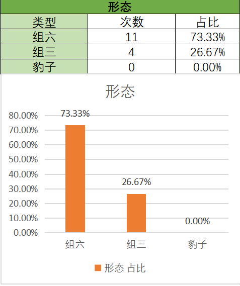 上期是组三类型,上期组六类型占比变小,组三占比变大,纵观最近15期形态,组六还是最热门的,其次是组三。所以本期还是优先考虑组六,防组三。
