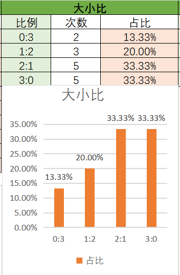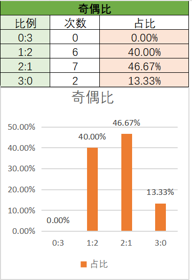 上期开了2:1,上期是2:1占比变大,而1:2占比变小。纵观最近15期开出的号码大小比,目前大数是最热门的,本期继续看好大数,比较看好3:0、2:1。