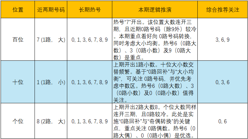 006期的开奖号码为 7 1 8。百位开出大数奇数7,十位开出小数奇数1,个位开出大数偶数8。大小比:2:1(大数优势)。奇偶比:2:1(奇数优势)。012路比:1:2:0(7为1路,1为1路,8为2路)。和值:16。跨度:7。形态特征:组六。本次开奖中,金胆“8”在个位开出,重点关注的“1路号码”和“大数”策略也得到体现(7、1、8)。和值16、跨度7均精准落在核心热区。