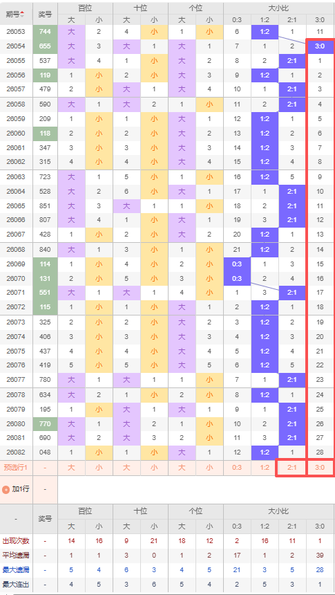上期大小比:1:2,近10期大小比出现情况:1:2、1:2、1:2、1:2、2:1、1:2、2:1、2:1、2:1、1:2,最近10期出4期2:1,出现6期1:2,出现0期0:3,出现0期3:0,根据近10期出号规律本期推荐遗漏28期出3:0,防隔期出2:1,综上所述大小比推荐:2:1,重点关注:3:0。