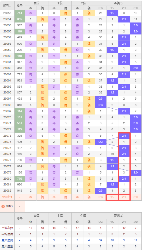 上期奇偶比:0:3,近10期奇偶比出现情况:2:1、0:3、2:1、2:1、1:2、1:2、3:0、2:1、1:2、0:3,最近10期出现4期2:1,出现3期1:2,出现2期0:3,出现1期3:0,根据近10期出号规律本期遗漏2期的2:1,防隔期出1:2,综上所述奇偶比推荐:1:2,重点关注:2:1。