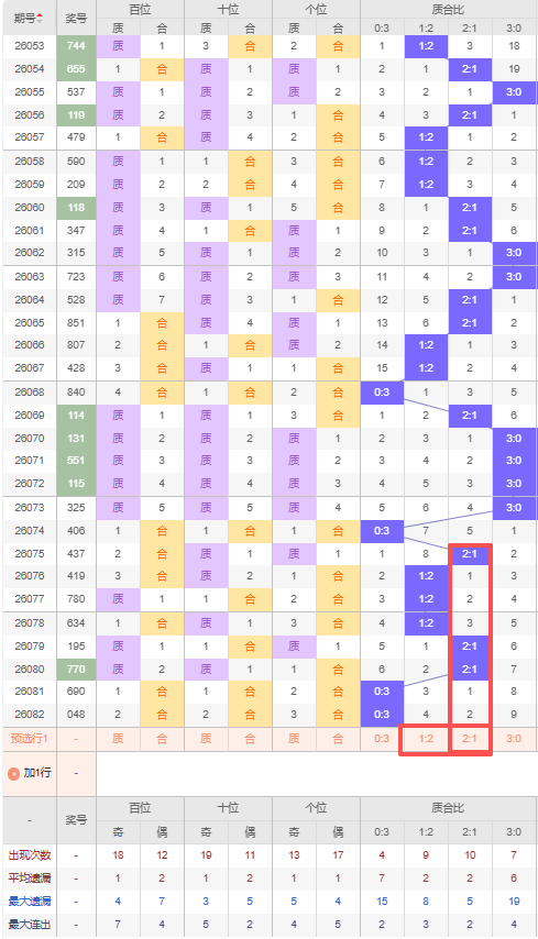 上期质合比:0:3,近10期质合比出现情况:3:0、0:3、2:1、1:2、1:2、1:2、2:1、2:1、0:3、0:3,最近10期出现3期2:1,出现3期1:2,出现3期0:3,出现1期3:0,根据近10期规律本期推荐遗漏4期的1:2,防遗漏2期出2:1,综上所述质合比推荐:2:1,重点关注:1:2。