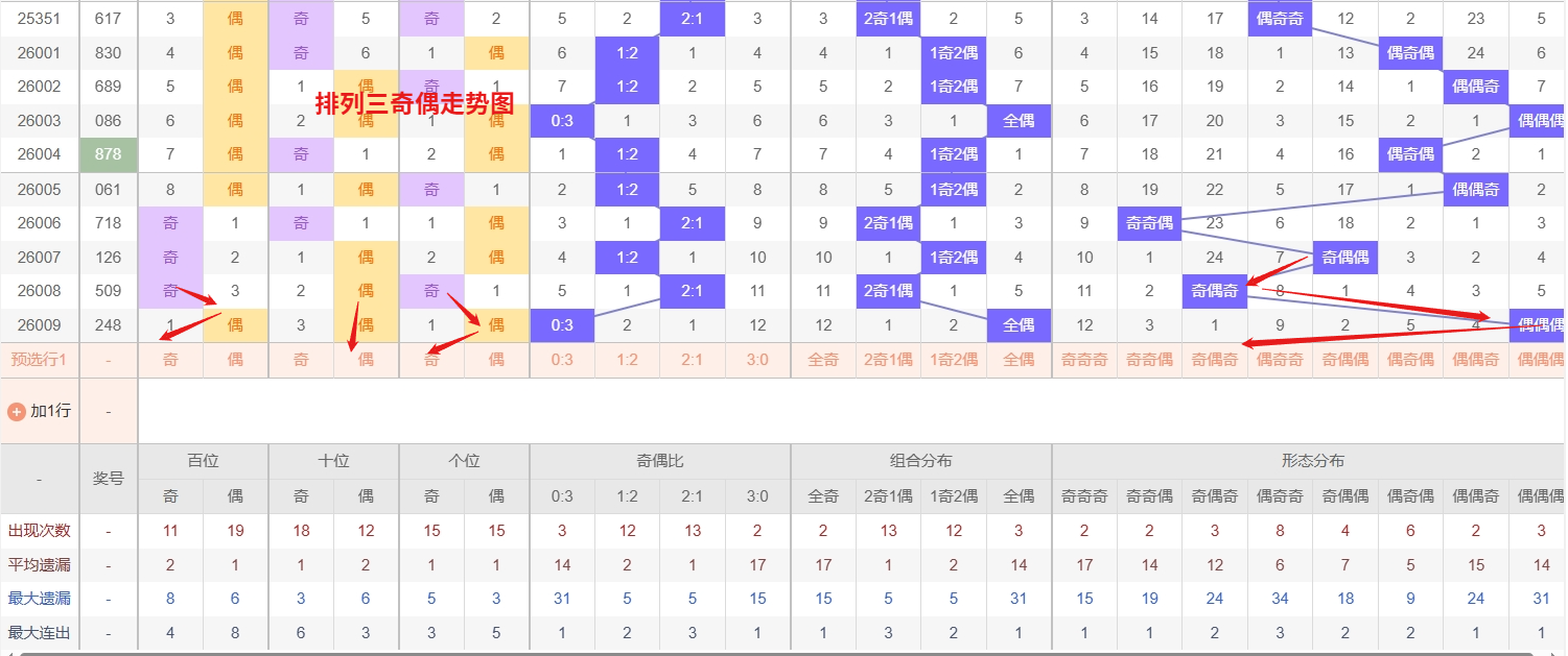 排列三 奇偶分析:从上图可以看出排列三100期内百位奇偶比约为54比46,十位奇偶比为53比47,个位奇偶比为51比49,个位的比值比较均衡,但是百位的比值偏差就有点大,历史奇偶形态近2期开出偶偶偶后下一期的走势为,第263期开出偶偶偶后264期开奇奇奇, 第282期开出偶偶偶后第283期开偶奇奇,第302期开出偶偶偶后第303期开偶偶奇,近期排列三奇偶走势分析来看,目前奇奇奇已平均遗漏较长时间,处于明显的冷态区间。历史数据显示,此类全奇形态在冷态积累后往往具备较强的回补压力,尤其在整体奇偶分布趋向平衡的阶段,需重点关注其突然出现的可能。与此同时,偶奇奇近期呈现热态,频繁开出显示其正处于活跃周期,短期内仍有延续热度、再次开出的迹象,所以排列三2026010期奇偶形态推奇奇奇与偶奇奇。