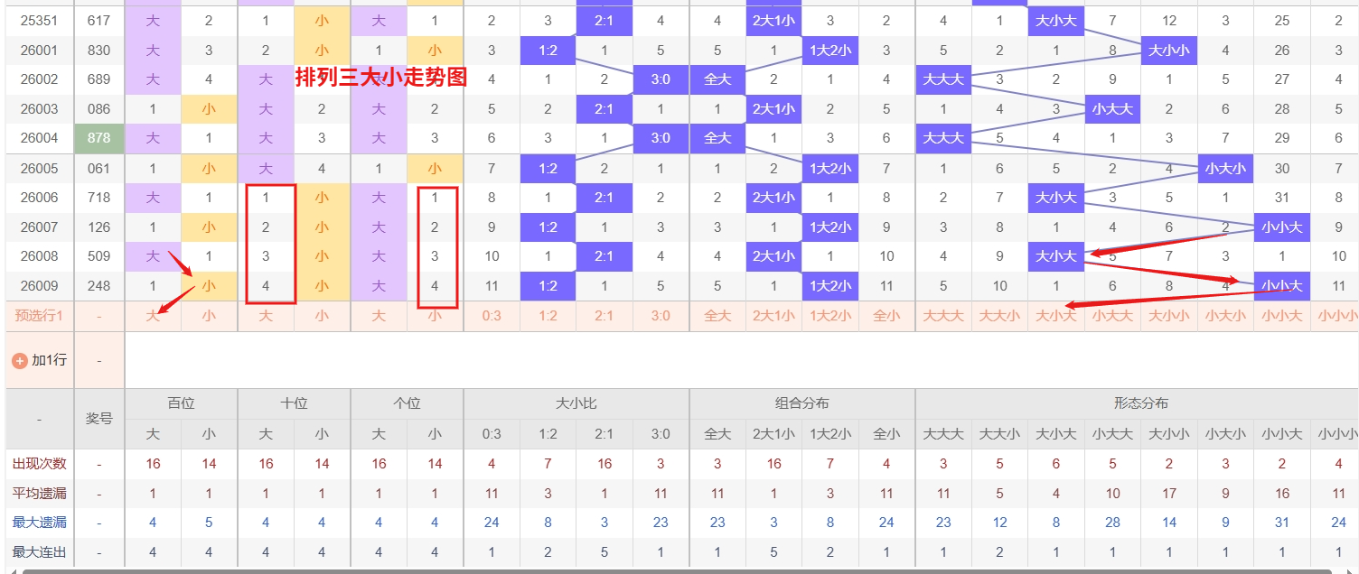 排列三 大小形态分析:从大小走势图上可以看出排列三100期内百位大小比约为49比51,十位大小比约为46:54,个位大小比约为53比47,除了个位奇数比偶数多,十位和百位偶数比奇数多。历史数据近2期开出小小大下一期的走势为,第286期开出小小大第287期开大大大。第292期开出小小大后第293期开大小小,第307期开出小小大后308期开小大小。近期排列三大小走势观察,形态大小小目前处于明显的冷态周期,遗漏值已累积至较高位置。根据历史出号规律,此类冷态形态通常在达到一定遗漏阈值后会产生回补需求,尤其在整体大小分布趋于动态平衡的过程中,其解冻的可能性正在逐渐增大,值得密切关注其后续走势。与此同时,形态大大大与小大小近期表现温和,出号频率稳定但未形成强势热度,所以排列三第2026010期大小形态推荐大大大防大小小。