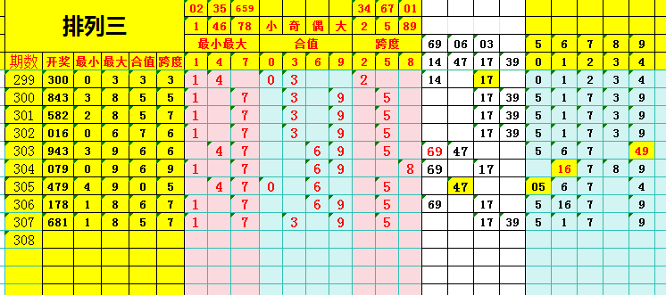 一是把最小与最大号码、合值、跨度进行分类及代码设置; (1)最小最大号码专指一注号码中最小与最大的数字。将 0-9 十个数字分为三组即012-3456-78956;分别用代码1-4-7表示;其中,代码 1 对应数字 012,代码 4 对应3456代码7 对应56789 (2)合值0-9 按奇(13579)偶(02468)小(01234)大(56789)划分 设定0369四个代码。代码 0 对应 0、1、2、3、4(小号),代码 9 对应 5、6、7、8、9(大号),代码3对应13579(奇数),代码6对应02468(偶数); (3)跨度0-9分为三组即234--567-8901,分别用代码258代替,即 代码2 对应 2、3、4,代码 5 对应 5、6、7,代码 8 对应 8、9、0、1。