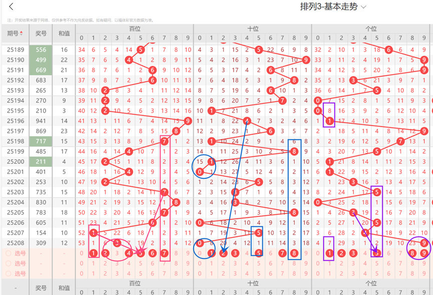 上一期百位开出号码为3,为奇数、小数、质数、0路号码:近10期百位较少开出09等号码,本期百位开出09等号码的可能性低,因此本期百位选号时可以不考虑09等号码,结合上述走势图看,本期百位看好124567等号码。